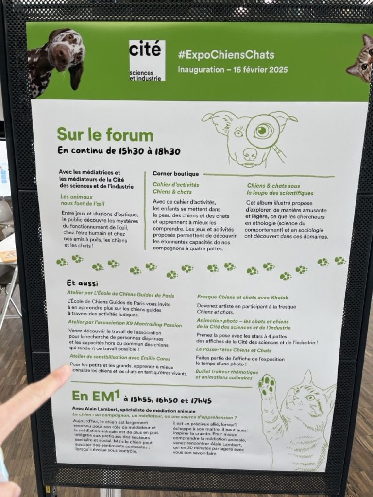 Dans le cadre de l'inauguration de l'exposition Chiens et chats qui s’est tenue le 16 février à la Cité des sciences et de l’industrie, nous cherchions une spécialiste en bien-être animal qui saurait s’adresser au public visé par l’exposition (jeunes enfants à partir de 6 ans) et leurs parents. Nous souhaitions également proposer à nos invités des contenus pédagogiques de sensibilisation traitant de la relation humain-chien/chat sous forme de jeux, et complémentaires aux sujets abordés dans l’exposition. L’atelier sur mesure d’EmilieCARES construit sur 3 axes (découvrir et comprendre les chiens et les chats pour mieux vivre avec eux, les chiens aidants et la prévention abandon et risque morsure) a répondu parfaitement à notre demande et volonté pour cet événement de transmettre des savoirs de façon ludique sur des enjeux de société.